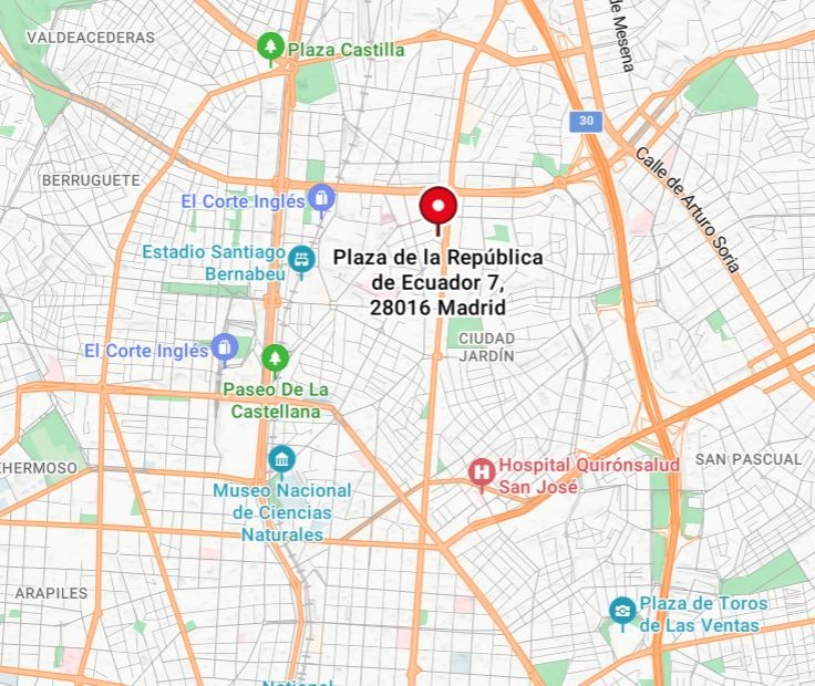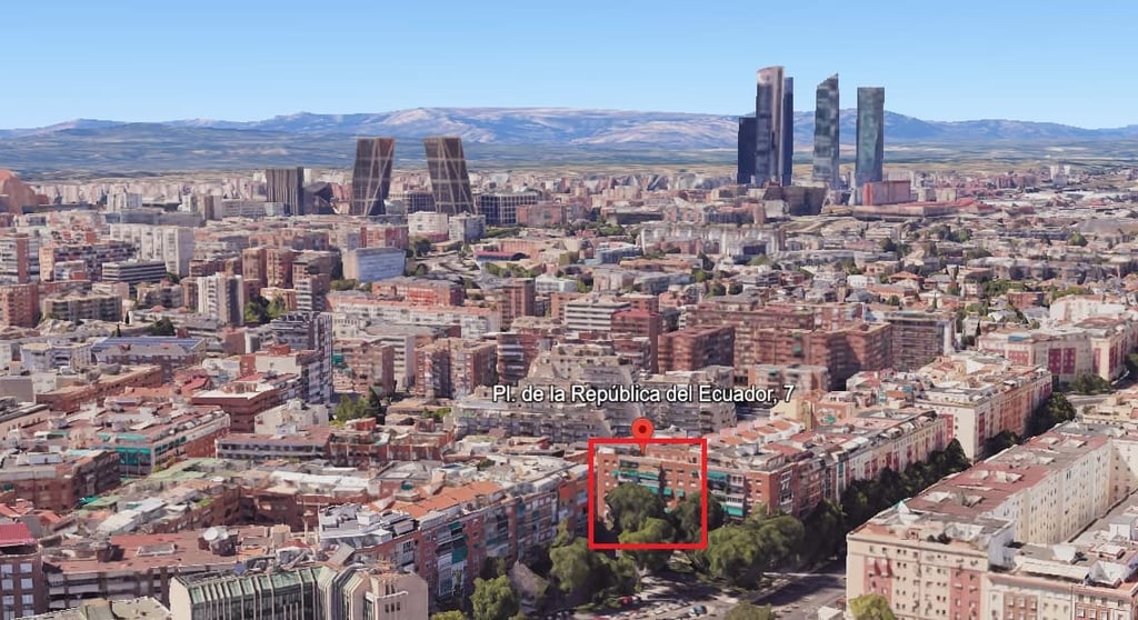 La vivienda se sitúa en Plaza República del Ecuador, en el barrio de Hispanoamérica (distrito Chamartín), una de las zonas residenciales más consolidadas y demandadas del norte de Madrid. Su proximidad al eje del Paseo de la Castellana, al área financiera de AZCA y al estadio Santiago Bernabéu refuerza su atractivo para perfiles ejecutivos y compradores internacionales.