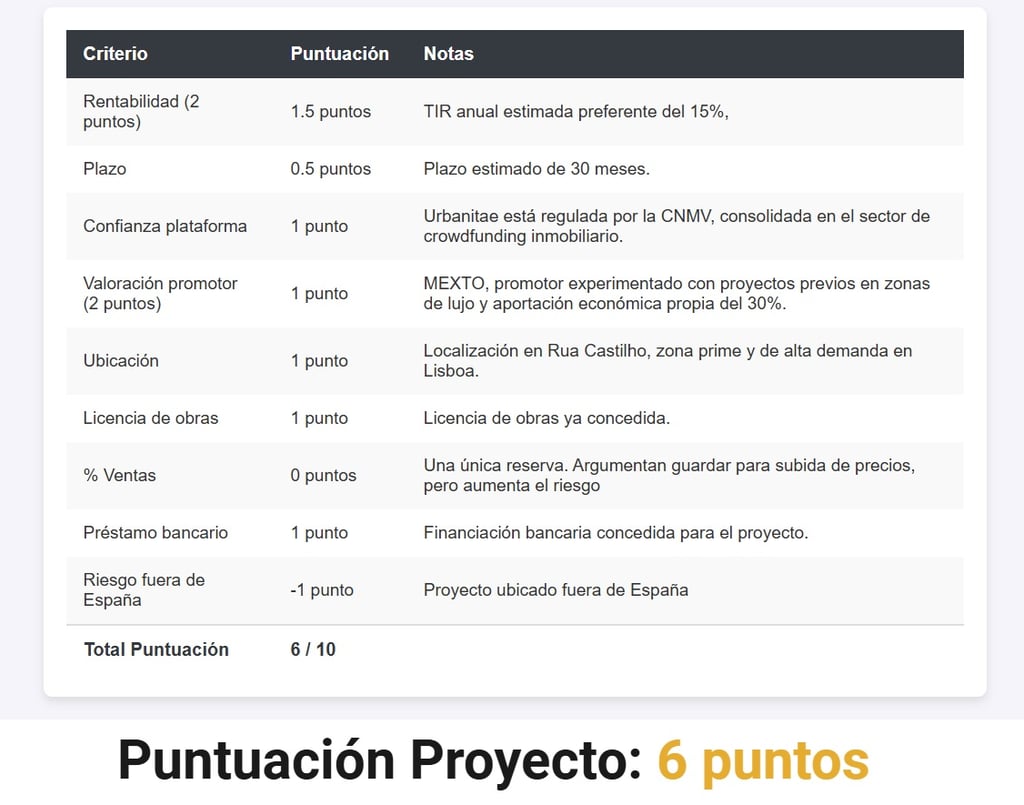 Informe del Proyecto de Crowdfunding Inmobiliario Castilho 3 en Lisboa que consiste en entrar en sociedad con el promotor para realizar la reforma y ampliación de un edificio existente en zona Prime de Lisboa para la creación de seis viviendas plurifamiliares de lujo.