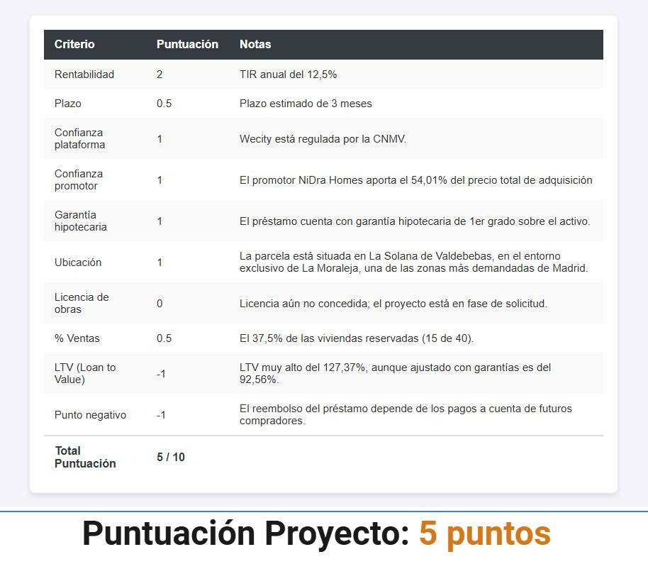 El proyecto "Madrid La Moraleja" ofrece una oportunidad atractiva de inversión a corto plazo, con alta rentabilidad a 3 meses, especialmente para inversores con experiencia en crowdfunding inmobiliario. Sin embargo, los riesgos inherentes a la inversión requieren cautela. No nos gusta especialmente que la dependencia de reembolso del préstamo dependa de los pagos a cuenta de los futuros compradores ( 3 meses ) y por ello restamos un punto adicional en la valoración del proyecto. Es fundamental diversificar la inversión y evaluar su adecuación a la estrategia financiera personal.